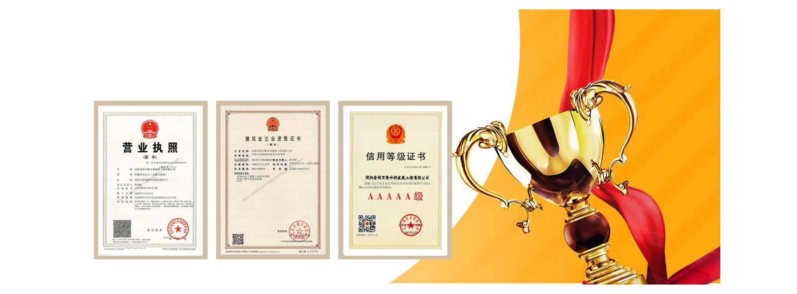 我公司先后受到遼寧省建筑業(yè)協(xié)會(huì)的好評(píng),遼寧省及沈陽市工商局頒發(fā)的重合同守信譽(yù)企業(yè)稱號(hào),勞動(dòng)保障監(jiān)察書面誠信等級(jí)A,信用遼寧網(wǎng)站公示AAA等級(jí),信用沈陽網(wǎng)站公示AAA等級(jí),水利安全生產(chǎn)標(biāo)準(zhǔn)化二級(jí)單位,中國水利工程協(xié)會(huì)信用AAA等級(jí),